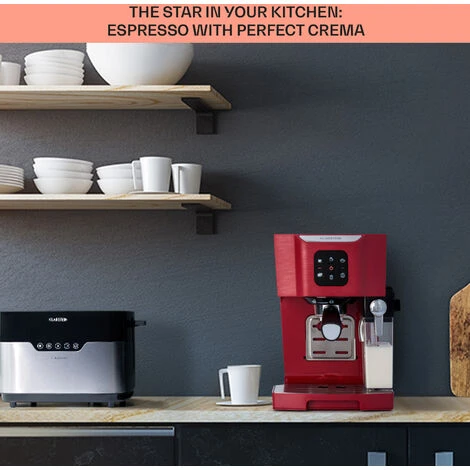 Enjoy the rich variety of the coffee world with the Klarstein BellaVita coffee maker! Thanks to easy preparation and One-Touch Control , aromatic enjoyment and perfect taste are pre-programmed. With a substantial 1450 watts of power and 20 bar pressure, the Klarstein BellaVita presses hot water through the ground coffee beans and thus unfolds its full aroma. You can brew espresso, cappuccino or latte macchiato as desired.
