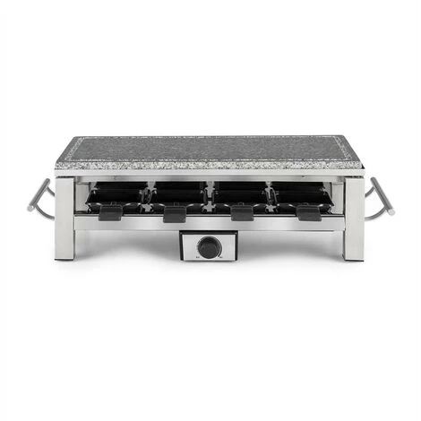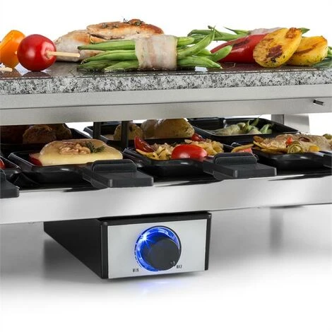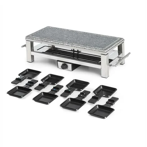 Thanks to the substantial power of 1500 watts, the Schmelzlette raclette is quickly heated up. The heat is stored in the scratch-resistant natural stone plate for a long time, which means that the food can be cooked extremely gently. In the lower part of the housing, up to 8 pans can be positioned, the contents of which can be removed quickly and easily thanks to their non-stick coating. The temperature is easily adjustable by a thermostat. A heat-resistant case and stainless steel side handles are not only high quality but also practical.