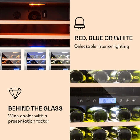 Elegant design and colourfully lit presentation: the Klarstein Vinovilla 43 Twin Built-In Duo double-zone wine refrigerator provides a well-chilled stage for your fine wines! In addition to the modern glass door, the Vinovilla 43 Built-In Duo impresses above all with its two cooling zones with different storage temperatures and the 3-colour interior lighting. In this way, it enriches living areas and kitchenettes, highlights delicate wine stocks with suitable light and ensures an optimal drinking and storage temperature.