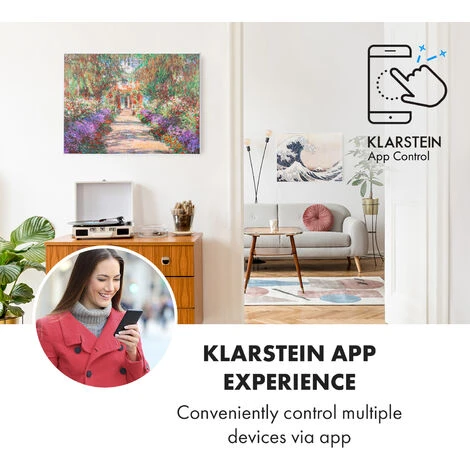 The Klarstein Wonderwall Air Art Smart infrared heater combines highly efficient heating power with attractive design and the latest technology. The 80 x 60 cm heating panel can be hung directly on the wall, is only 5 cm high and hardly bigger than a framed picture. With its powerful 500 Watt output and owing to IR ComfortHeat it spreads very pleasant heat for the human skin without getting lost in the air. Thanks to infrared technology, the heating panel is extremely energy-efficient and environmentally friendly, as a full 98 % of the power is converted into radiant heat. Smart functions for control via app, thermostat, auto switch-off function and IP44 protection class skilfully round off the innovation.